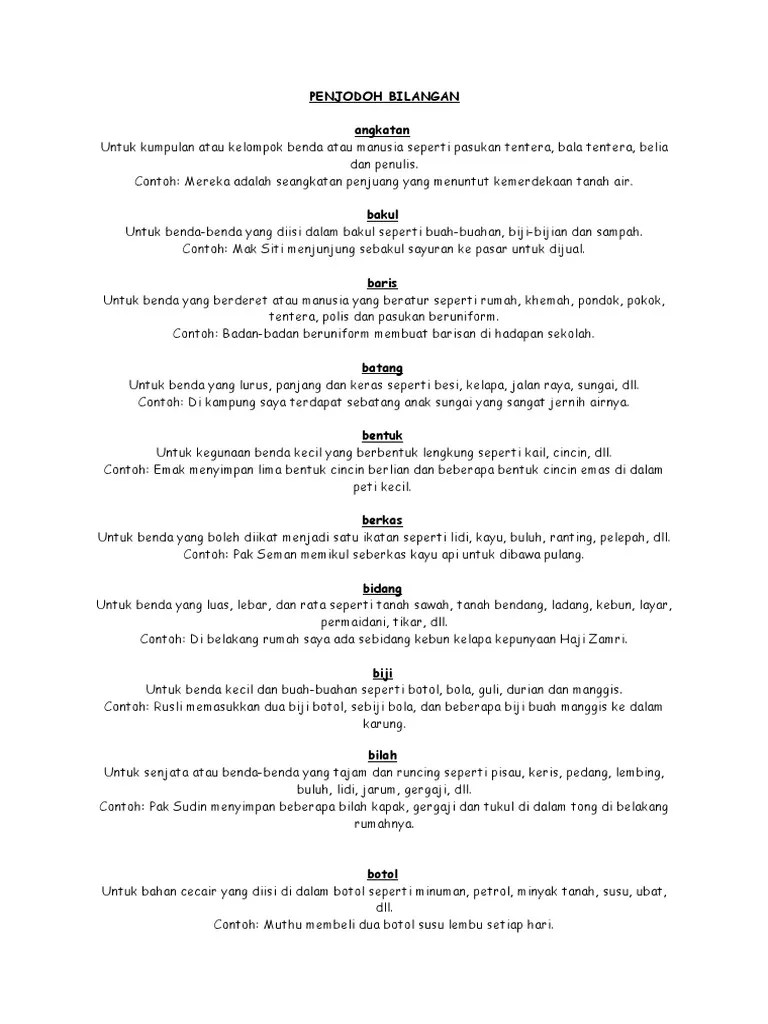 Gigi, kapur, lilin, tongkat, kayu, penyapu, jalan raya 5 bentuk 小, . Penjodoh bilangan ialah perkataan yang digunakan berpasangan dengan kata nama untuk. Penjodoh kegunaan contoh bilangan untuk sekumpulan kapal, tentera,. Penjodoh bilangan untuk kata kerja (mv). Penjodoh bilangan untuk bekas (mo). Penjodoh bilangan berfungsi untuk menerangkan aspek bilangan sesuatu benda, tempat, hal, perkara, dan manusia. Karim sedang memanggang lima belas. Digunakan untuk bilangan benda yang panjang. Banjir kilat telah menyebabkan beberapa. Digunakan untuk benda yang panjang seperti pen, pensel, sungai, tongkat, . Penjodoh bilangan digunakan sebelum sesuatu kata atau nama.